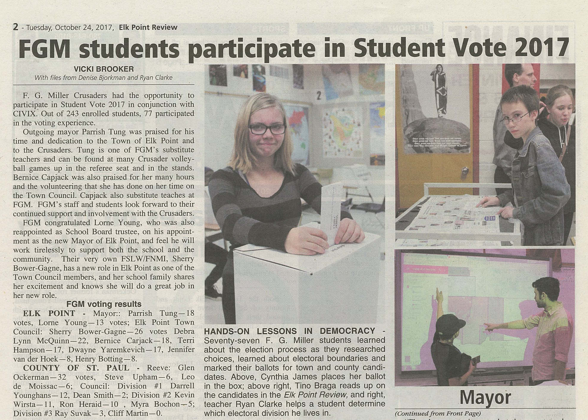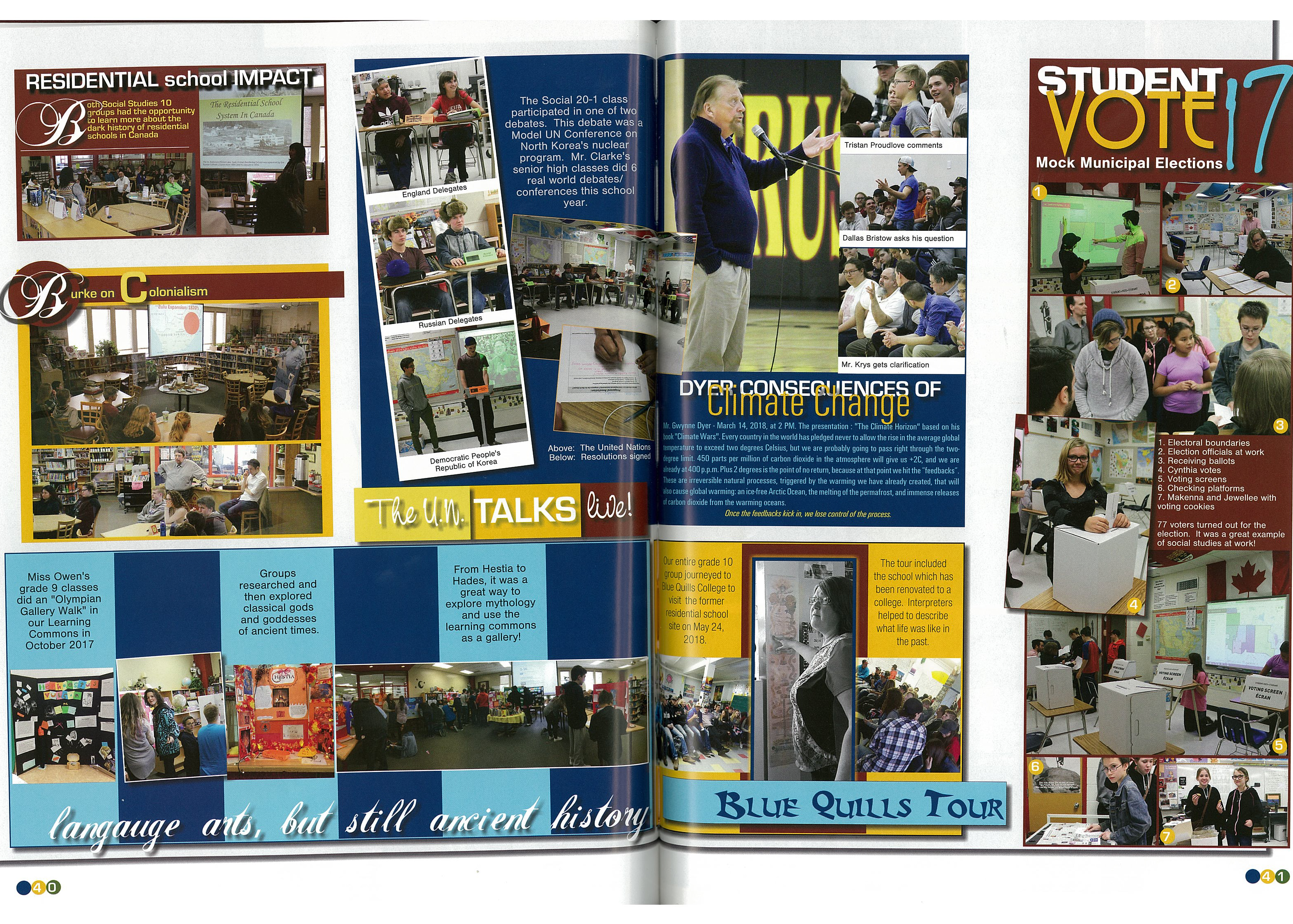 I am always looking for ways to get my students interested in real world applications of the things I teach in class. One of the ways I do that with my students is by organizing the CIVIX student vote during elections. Here are some photos of one (out of four) I have done during my career at FG Miller. There is also information about a field trip tour of a residential school that I have taken my students on a couple of times.